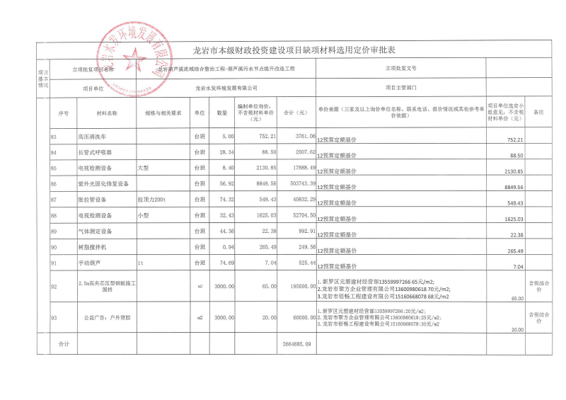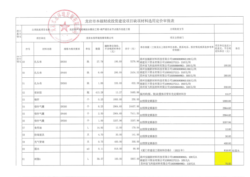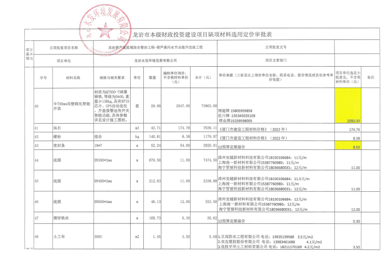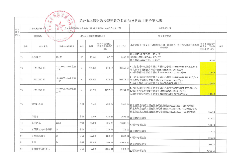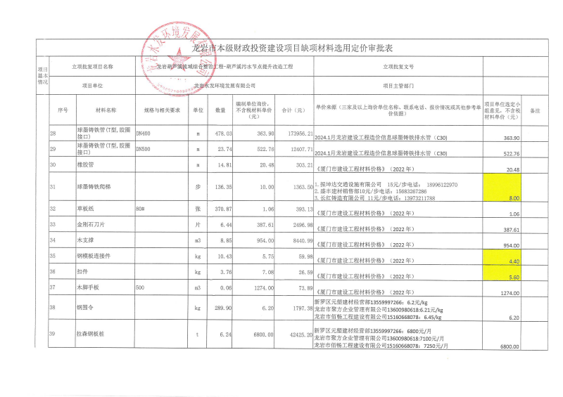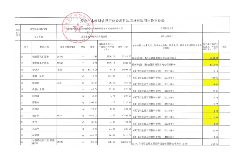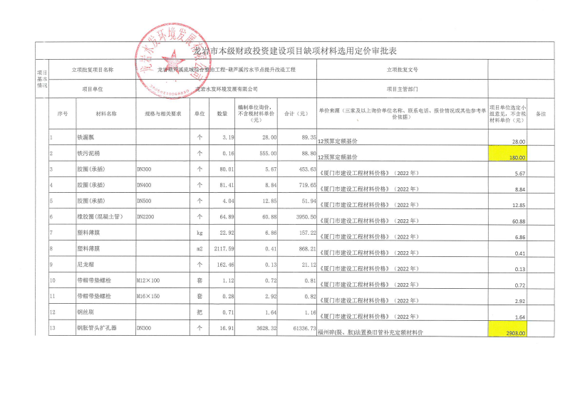 龍巖中心城區污水處理廠網系統提質增效工程-東肖排水泵站及配套管網工程缺項材料選用定價公示