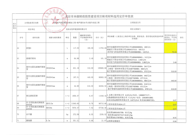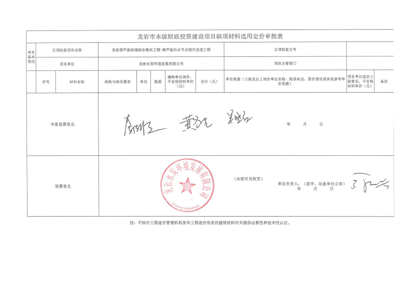 龍巖市本級財政投資建設項目缺項材料選用定價審批表